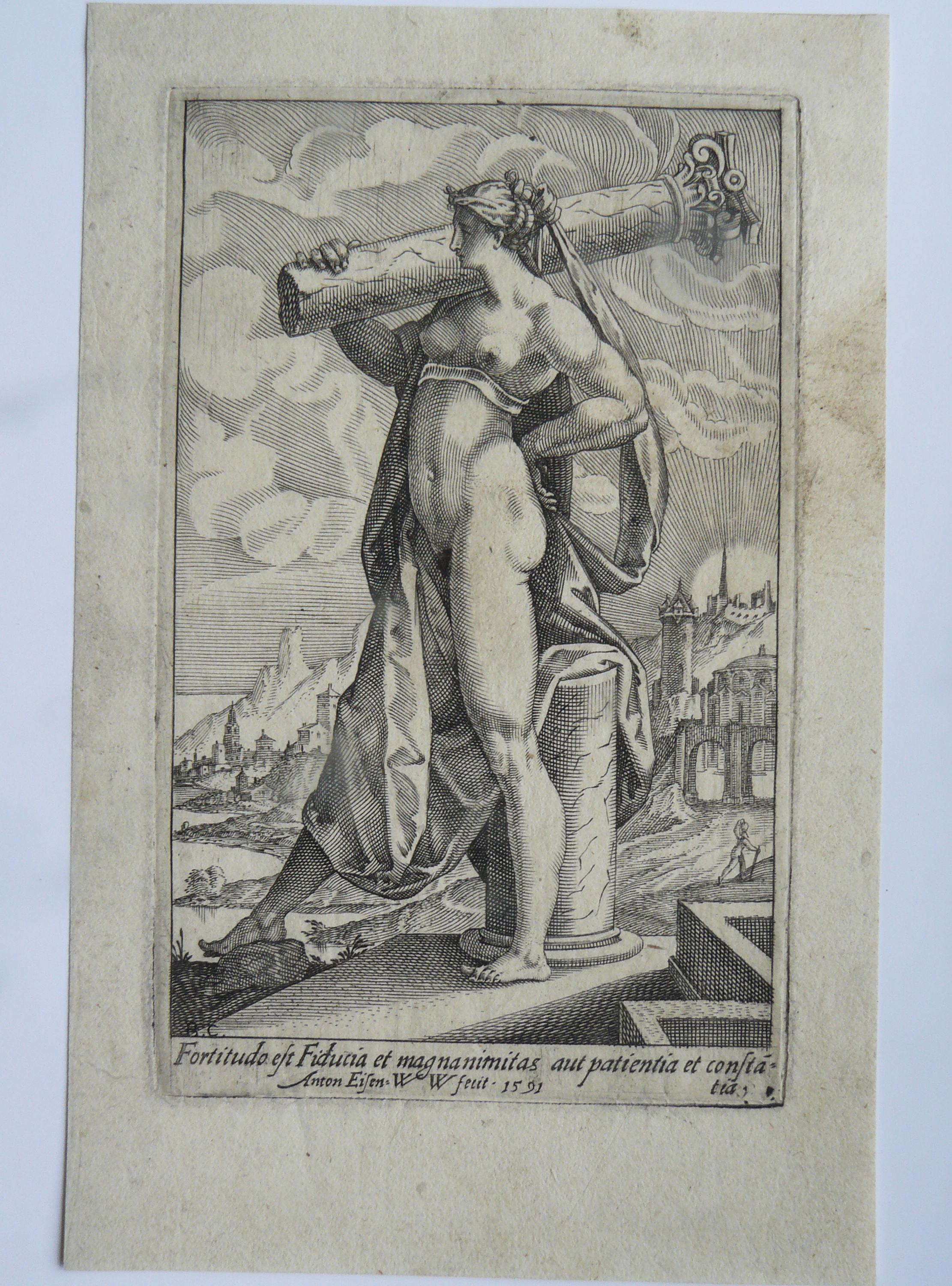 Planche titrée « Fortitudo est Fiducia et magnanimitas aut patientia et constatia », issue d'une série de 8, dite des Vertus (« Die Tugenden »).