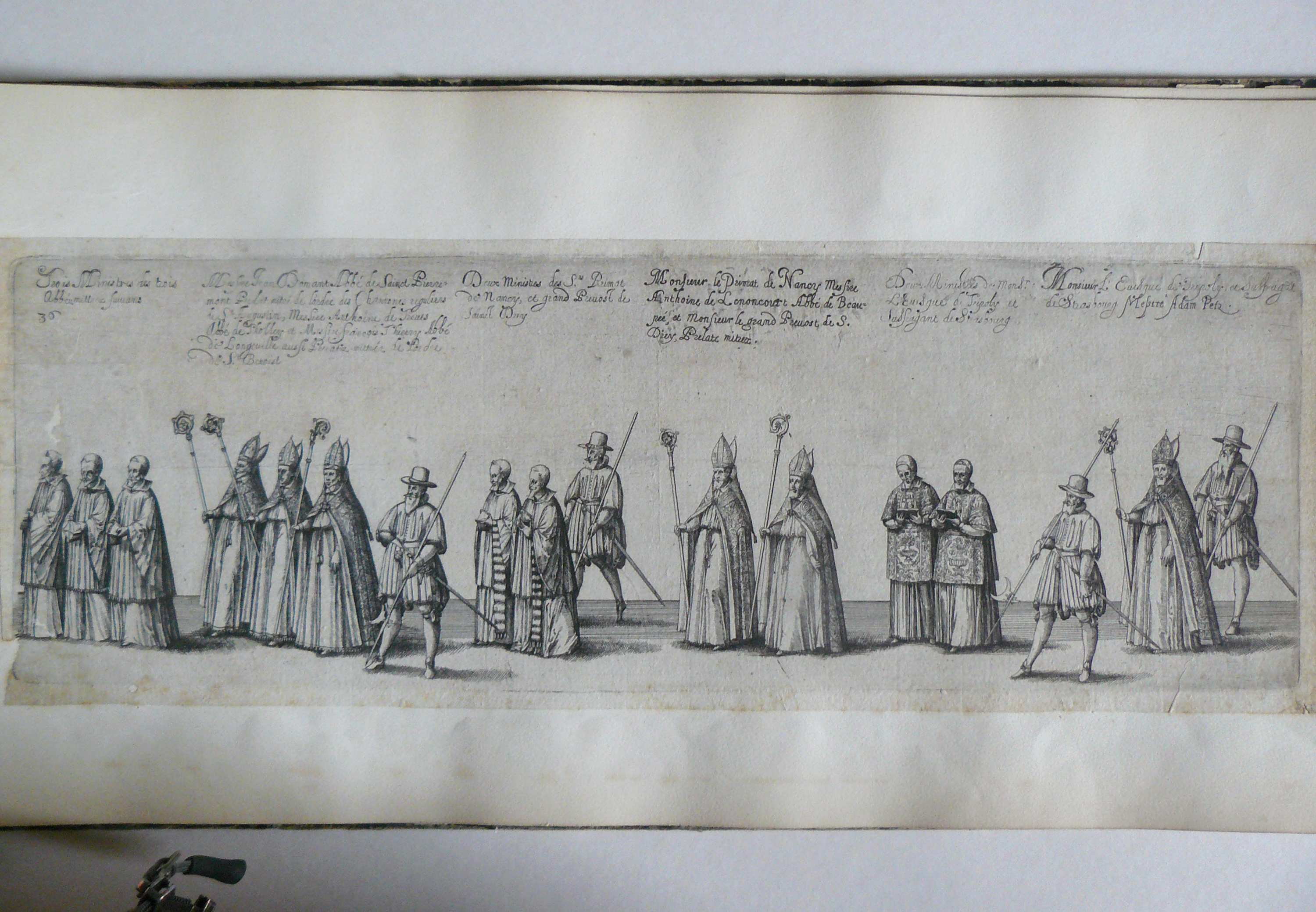 Cette planche représente le défilé des abbés mitrés, dont Jean Domant, abbé de Saint-Pierremont, prélat des chanoines réguliers de Saint-Augustin, etc.