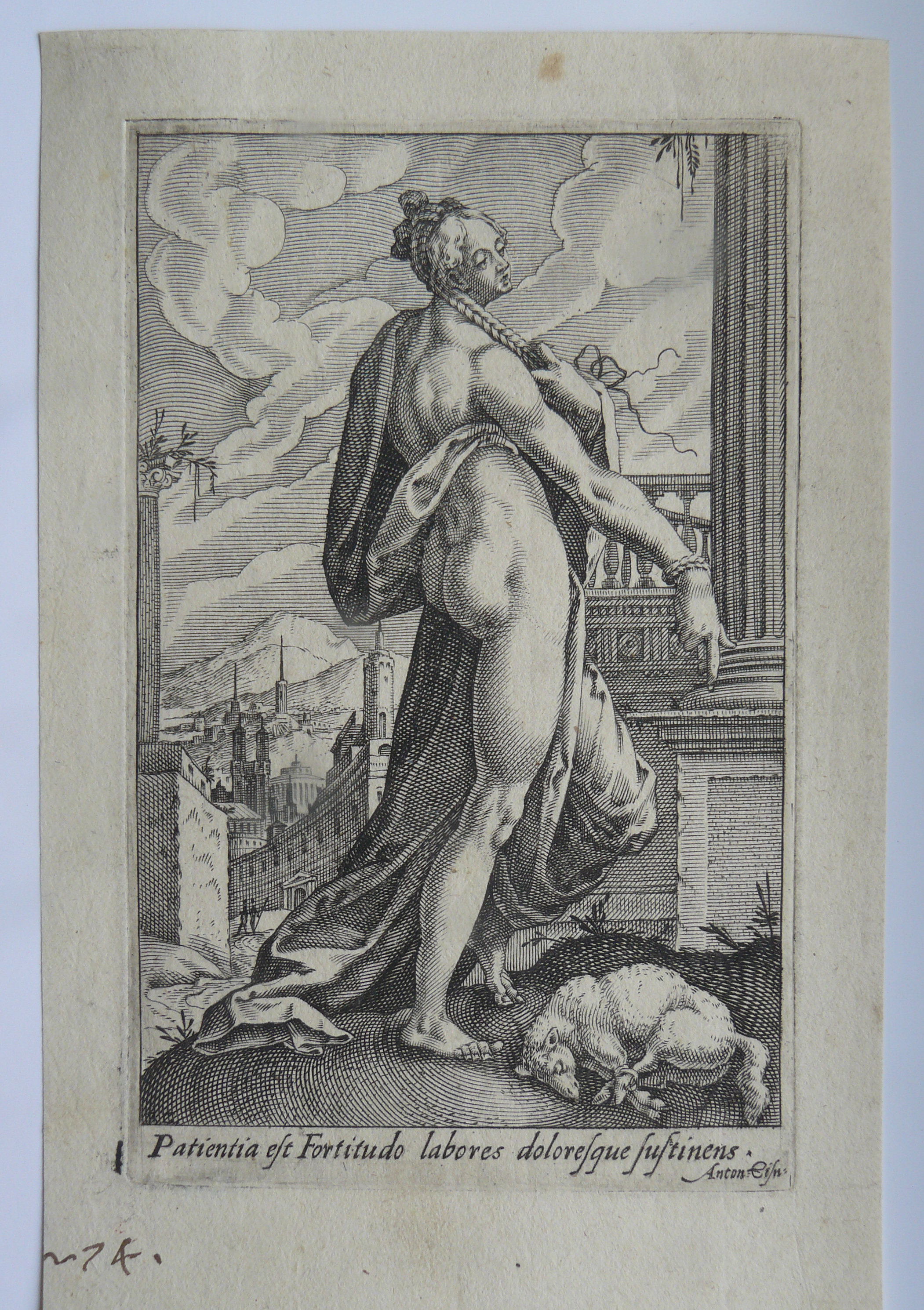 Planche titrée « Patientia est Fortitudo labores doloresque sustinens », issue d'une série de 8, dite des Vertus (« Die Tugenden »).